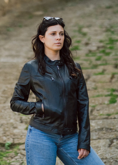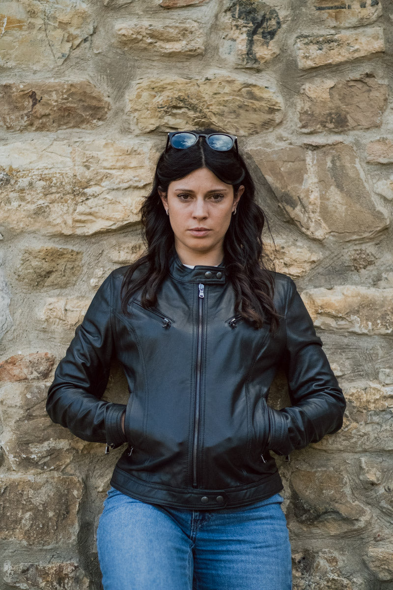 Giubbotto in vera pelle con cerniera centrale, dalla vestibilità aderente.